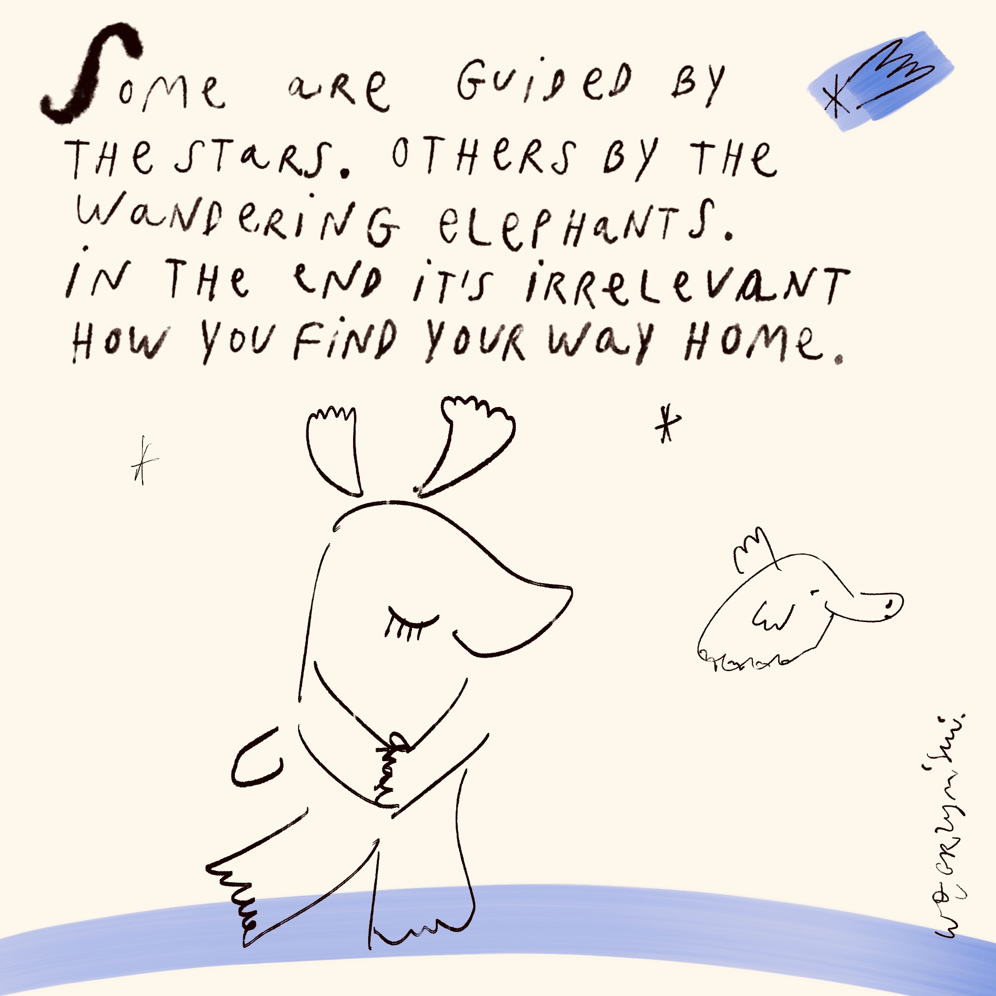 Home 1 January 2024 Wojciech Węgrzyński * Some are guided by the stars. Others by the wandering elephants. In the end it’s irrelevant how you find your way home.